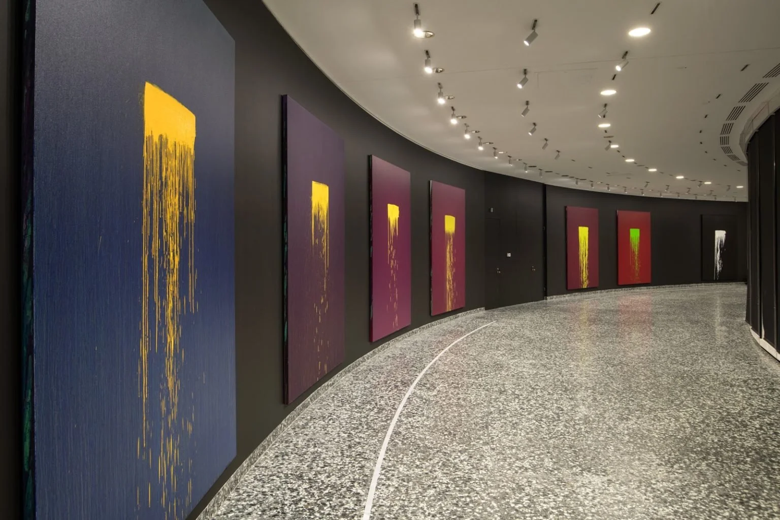 This exhibition enamors visitors as they move through the space really exploring the spectrums of the wheel itself. Each solid color canvas is complemented by a waterfall of color popping out from the monochrome background. By walking around the gallery, visitors are able to watch as the canvases shift hues and reflect every aspect of the color wheel, as seen by Steir.